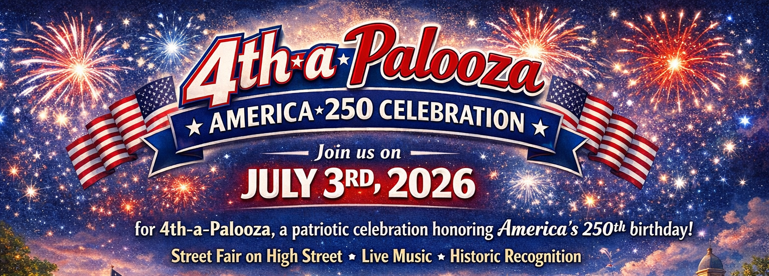 Join us on July 3rd, 2026 for 4th-a-Palooza, a patriotic celebration honoring America’s 250th birthday. This family-friendly event brings together regional visitors, local families, veterans’ groups, and civic organizations for a day filled with community pride and hometown spirit. Enjoy a lively street fair on High Street, live music, and special moments of historic recognition as we celebrate our nation’s past, present, and future together.